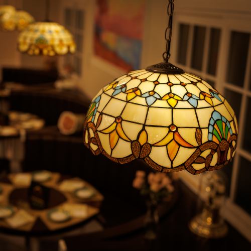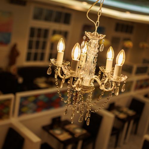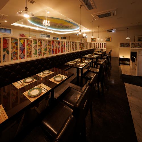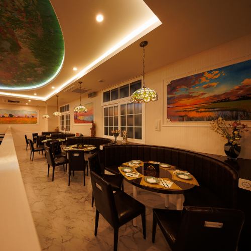 《非日常空間》美しい絵画やステンドグラスを一望できる非日常空間。店内に一歩足を踏み入れると、まるで地中海に広がる爽やかで幻想的な空間。1つ1つ手作業で制作した絵画の雰囲気は、まさに圧倒的な臨場感。ゆったりとした照明と絵師が手掛けた天井が、優雅でロマンティックなひとときを演出します。