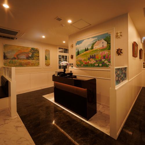 《記念日や女子会に》エレガントな幻想空間。ラグジュアリーさを感じれるようテーブルは全て大理石のデザインで統一。こだわりの内装は、落ち着きある照明だけでなく、温もりを感じれる白の色合いと質感の素材で表現。大人のプライベート感ある幻想的な空間で絵画を眺めながらロマンティックな雰囲気をお楽しみください。