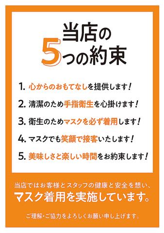 安心安全なお店づくり。当店では感染予防として衛生面はもとよりスタッフ一人一人が予防を行うこと、お客様には安心してお食事を楽しんで頂けるように徹底しております。