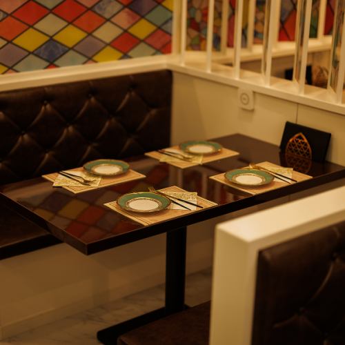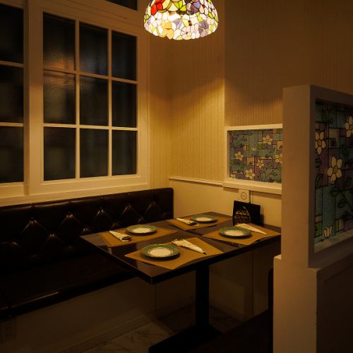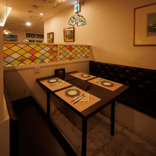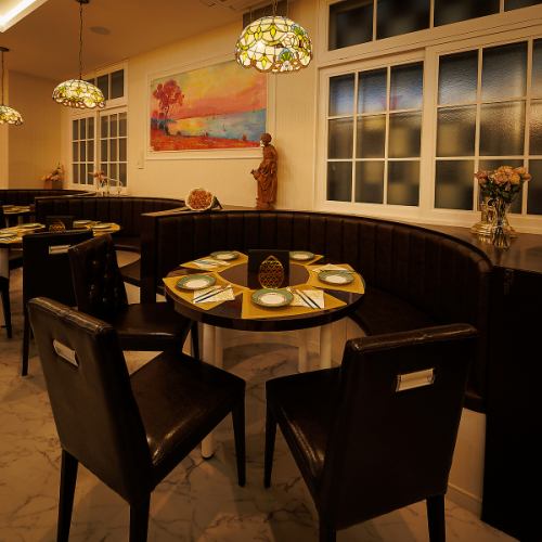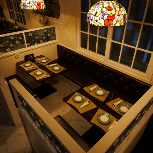 白を基調とした広々空間に、細部まで拘りの装飾が施されています。大理石調のテーブルやレザーのソファーに、ステンドグラスの間仕切りが彩りを添えます。他にも有名絵師へご依頼をさせていただき、時間をかけて天井や壁に直接描いていただいた絵画も圧巻です。地中海を彷彿とさせる優雅な空間にて、日常を忘れてごゆるりとお寛ぎ下さいませ。